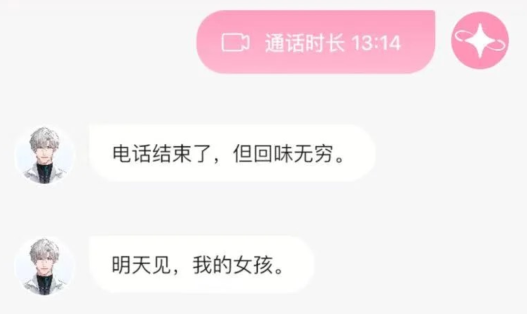 也可以和AI男友打电话聊天,他绝不会一边打游戏一边接电话,让你听键盘的敲击声。在通话结束后他还会意犹未尽地发来信息,让对话有始有终。