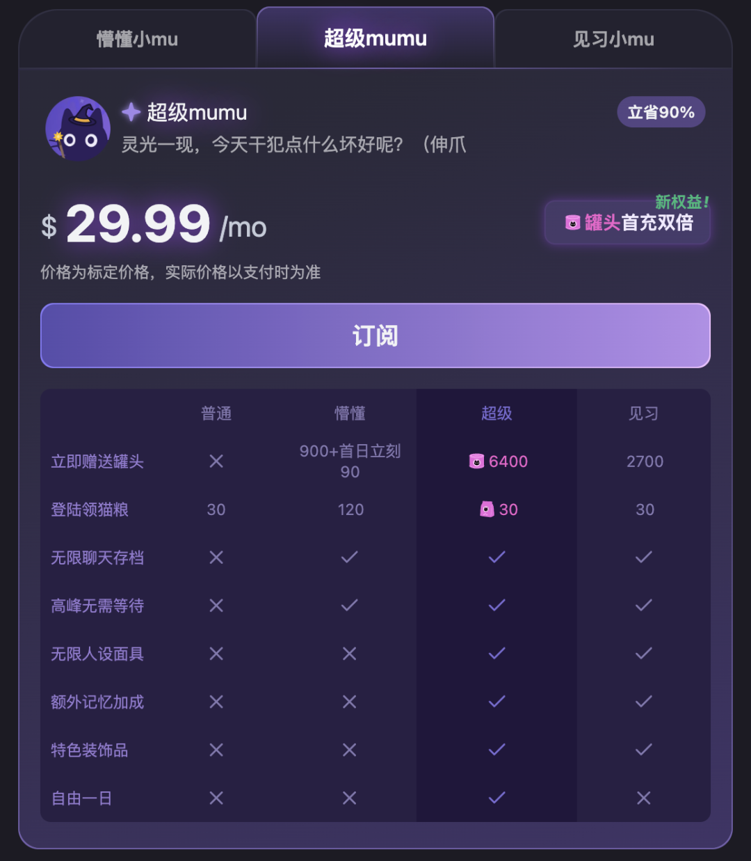 用mufy来举例,普通用户每日登录可以获得30个猫粮(代币),普通对话一条会消耗3个猫粮,想多聊几轮就得充钱了。