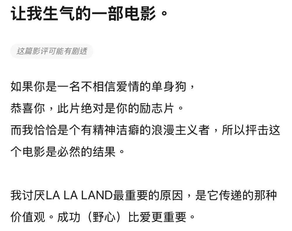 “我讨厌LA LA LAND最重要的原因,是它传递的那种价值观。成功(野心)比爱更重要。”这是她第一次留言,怒气冲冲。之后,她多次更新这条影评。
