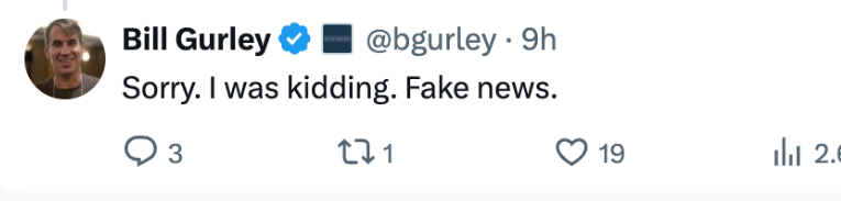 几乎同时,那位“官宣”的Bill Gurley也更新了状态,轻描淡写地来了一句:“Sorry,I was kidding.Fake news.”