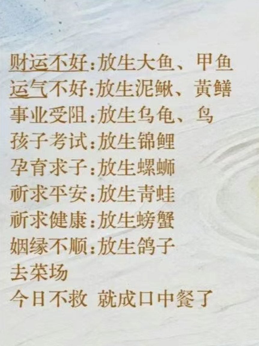 他们曲解了佛学典籍,把无机物和食物也当作生命放生,重点只在于我完成了这个放生流程,这份功德能记我账上,至于放的是什么,根本就不重要了。