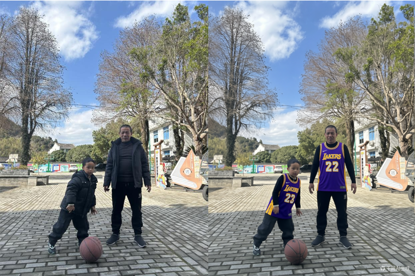 李梦星抓拍了一张两人打球的照片,用AI给他们换上了湖人队的球衣。