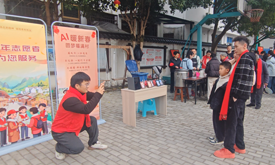 还有一家三口,从县城回村过年。小男孩拍照时有点腼腆,怎么逗都不太笑。李梦星给他们生成了一张雪地里的合影,漫天雪花,小男孩咧着嘴,笑得特别开心。妈妈盯着照片看了很久:“南方都不下雪,但他笑成这样,好像真在雪地里玩过一样。”