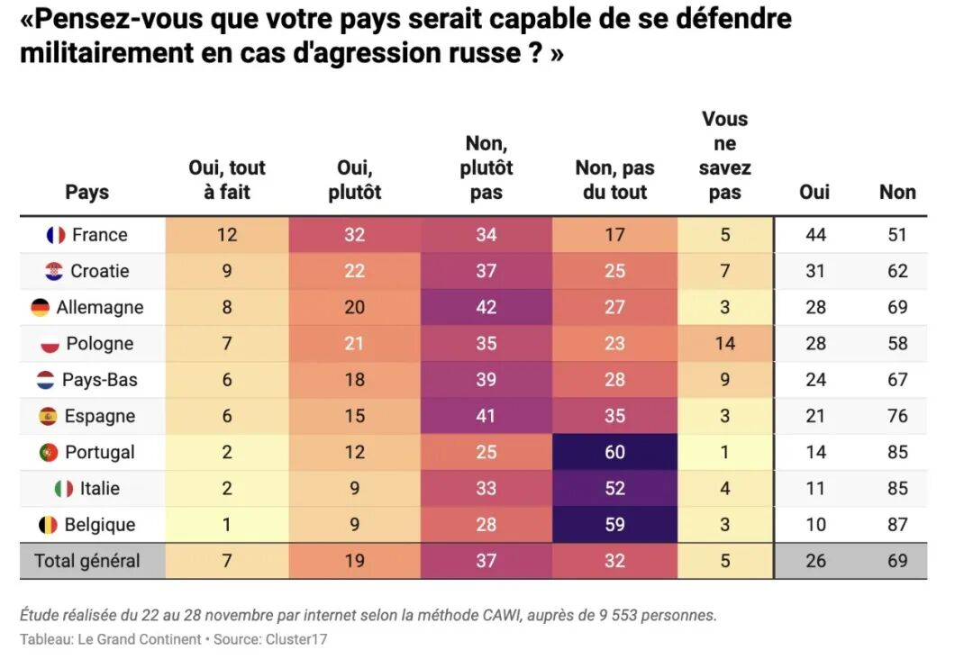 Cluster 17于2025年12月进行的民意调查显示,在欧洲九个国家民众中,69%的受访者表示,他们的国家“完全没有”或“不太有能力”抵御俄罗斯的攻击。