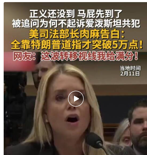 另一件事情知名度更高一些。面对国会质询时,忠于特朗普的司法部长帕姆·邦迪压根不像是一个司法部领导,而像是一个喷子,对议员质问的问题多次没有正面回应,攻击对方转移话题,甚至说出了“现在标普过五万点了,你们为什么要在这个案子上揪着不放”这种非常莫名其妙的话,引发美国网络舆论狂喷。