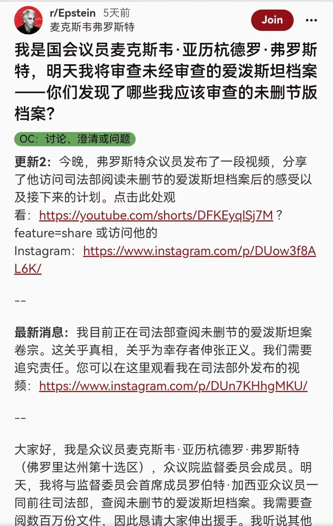 比如民主党议员杰米·拉金斯就表示,自己在档案里发现特朗普的名字被提到了超过一百万次;而年轻的议员麦克斯韦·弗罗斯特则直接在reddit讨论爱泼斯坦文件的板块,问大家有什么想要看的。