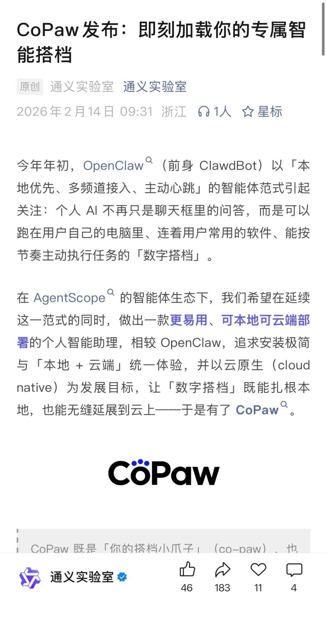就在这条消息发出的前一天,阿里云通义团队发布了CoPaw。