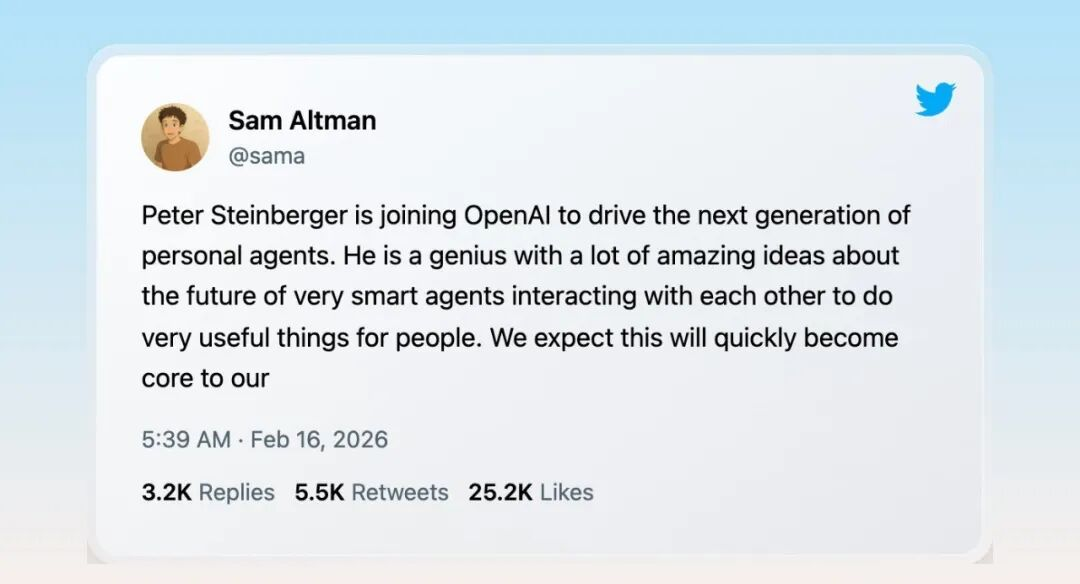 2026年2月15日,Sam Altman在X上宣布:Peter Steinberger加入OpenAI,将主导下一代个人Agent的开发。OpenClaw项目将转入一个独立基金会,由OpenAI继续支持。
