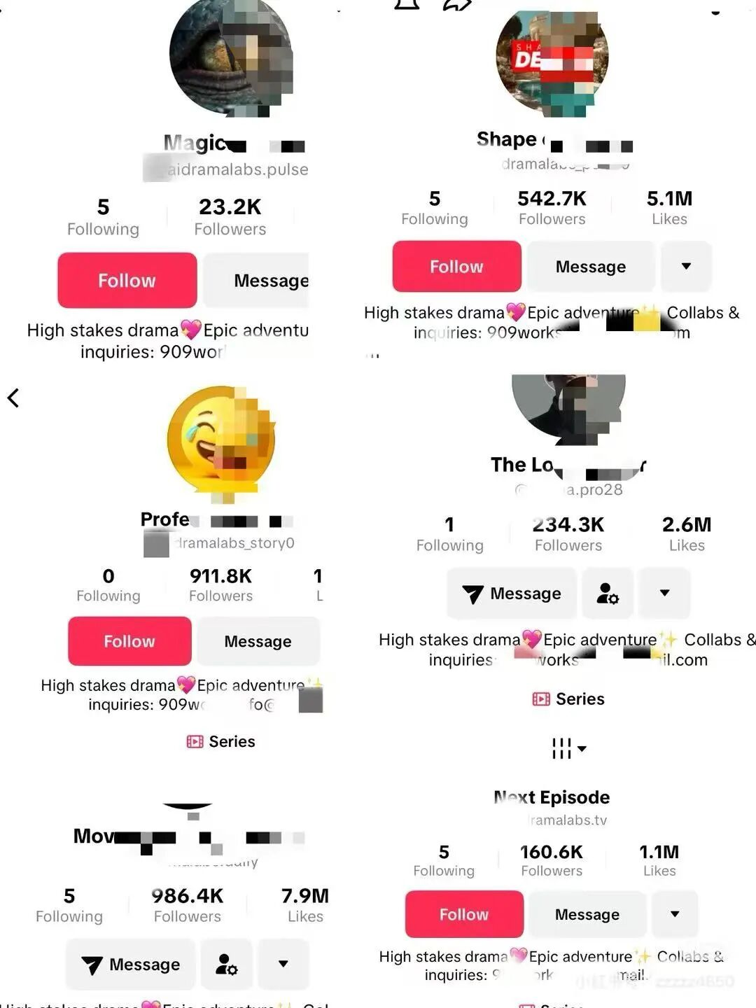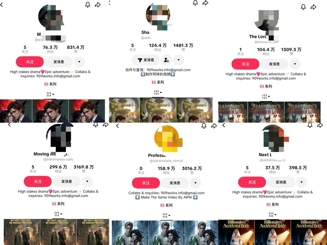 而这六个tiktok账号矩阵中多个百万级体量,再次证明海外AI短剧矩阵账号已然成熟。