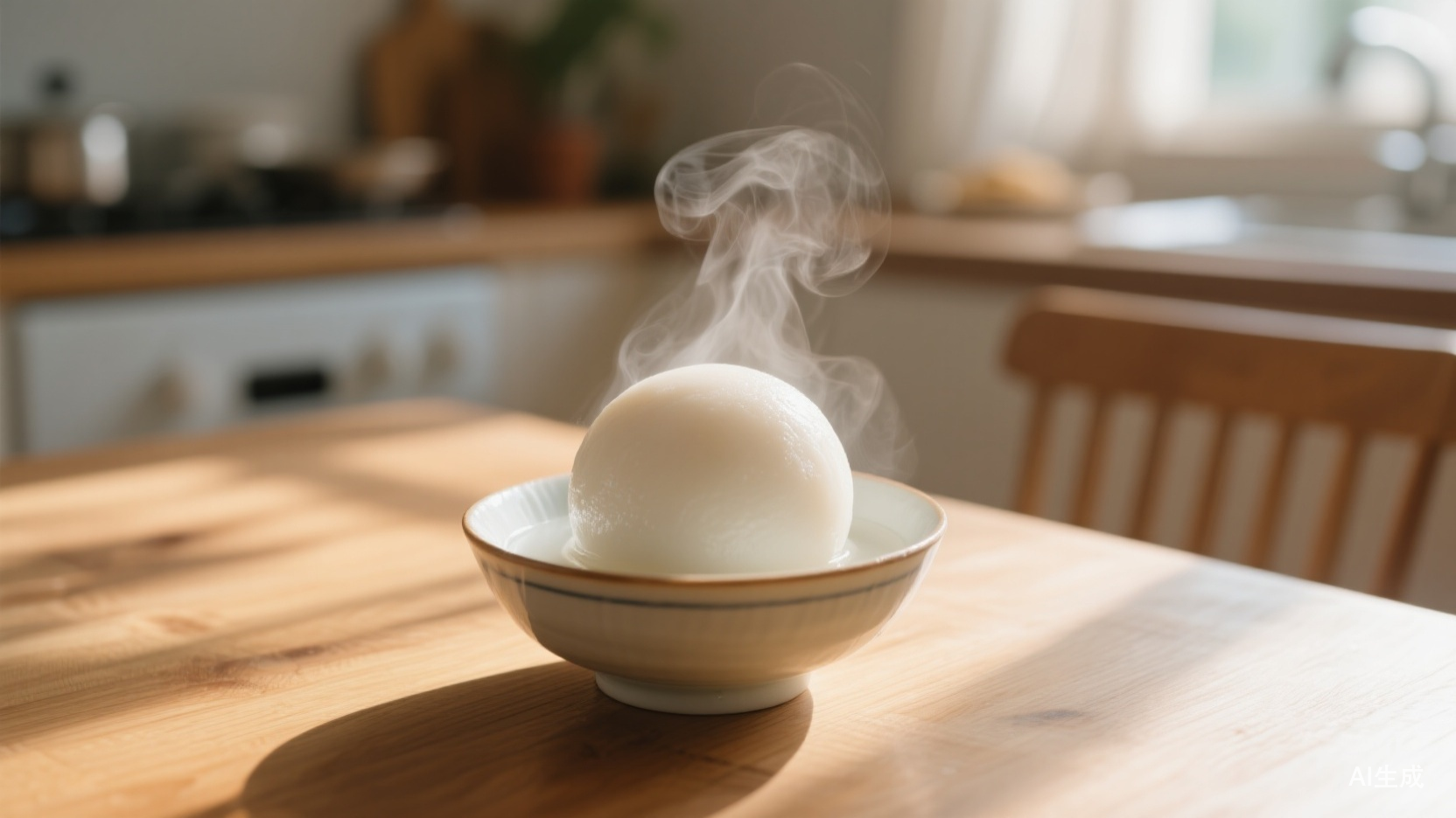 你低头看着碗里那个雪白浑圆的巨型球体,内心默默OS:“奶,这大白汤圆成精,我能不吃吗?”
