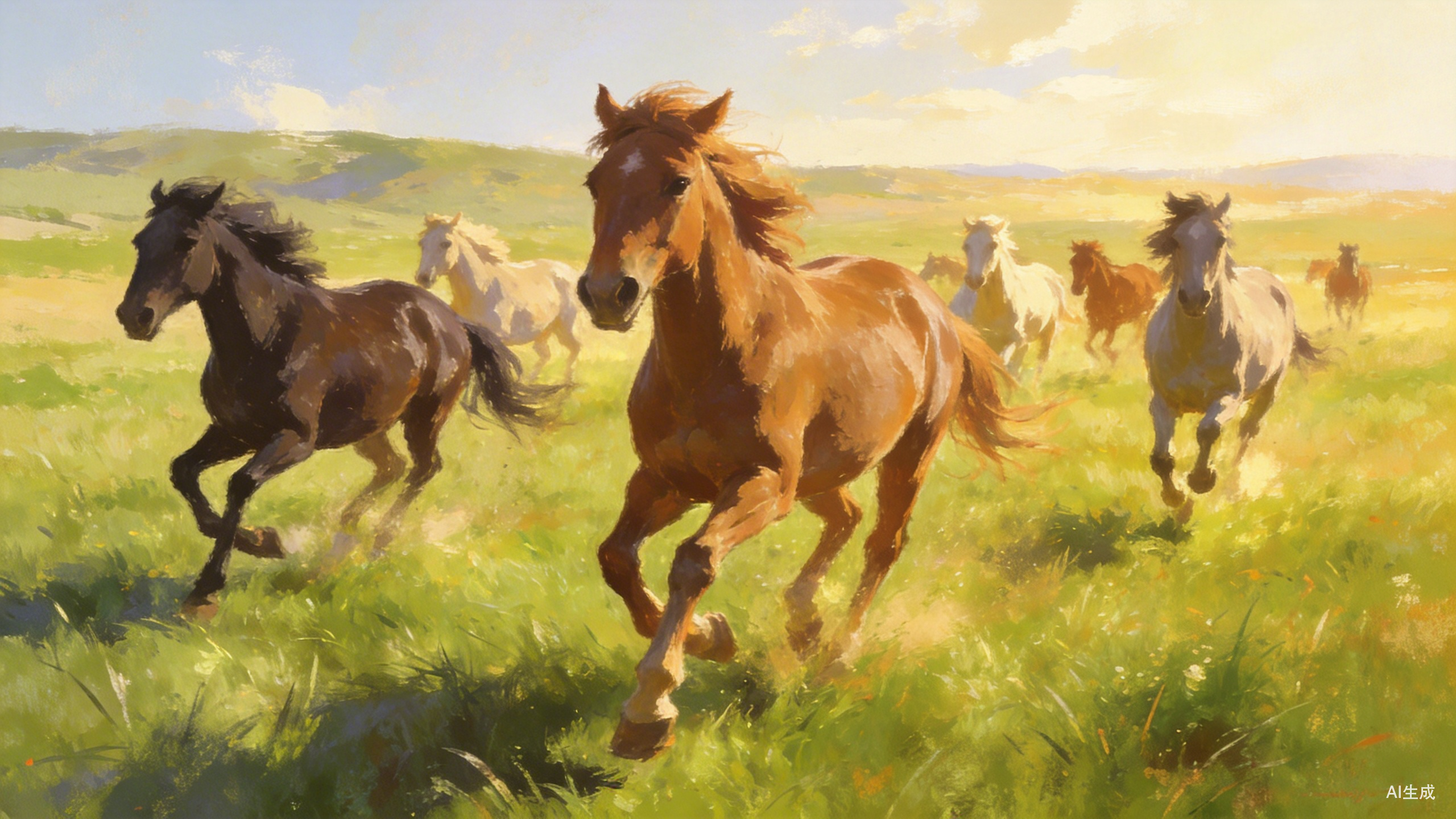 有些动画将镜头直接放在马群之中,远处是起伏的地平线,近处是奔腾而过的马蹄,空气中回荡着节奏分明的“哒哒”声。跟随着马儿矫健的身影,我们也仿佛与它们一同置身于辽阔的草原上。