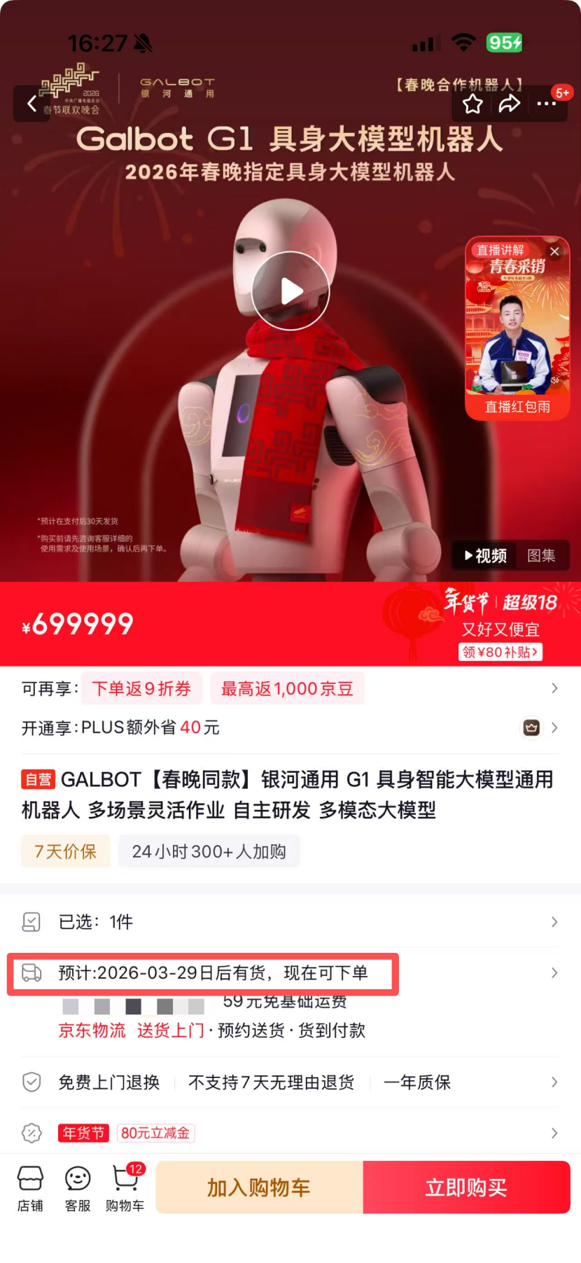 据媒体报道,银河通用表示Galbot G1近300台被连夜加购,目前已紧急调配产能,加班赶工保障交付。此外,魔法原子春晚同款机器熊猫售价2026元,已显示售罄。