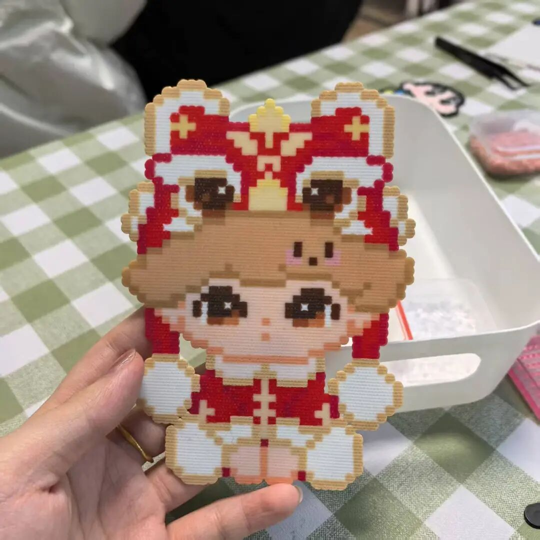 两个小时过去,密密麻麻的小圆柱体紧密地排列在了板上。店员接过他的模板,走向角落里的熨烫区。伴随着“滋”一声轻响,一股白色的热气从缝隙里冒出来。空气里弥漫开一股淡淡的、类似电熨斗刚熨过纯棉衬衫的味道。原本松散排列、一碰就会散的豆子,已经被热力永久地“焊接”在了一起。4个像素小人整齐地躺在桌上。