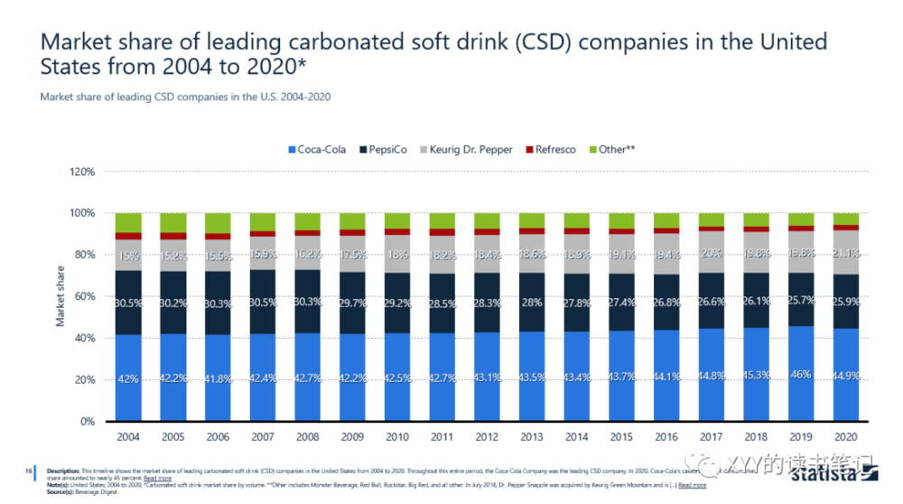 可口可乐又赢得了可乐战争。2008年的北京奥运会,可口可乐抓住契机全力以赴,增加在中国市场影响力(2009年宣布未来3年在中国额外投资20亿美元)。此外,穆泰康宣布可口可乐2008-2011年将每年节省5亿美元用于品牌建设,并宣布到2020年预计日均销量达到30亿份(翻倍,看下图营收增长,应该是没做到)。可口可乐开始全盘控制美国几乎所有分销渠道,并不仅专注于让产品无处不在,而且细化到产品放置的地方(比如可口可乐和雪碧要占据走道),达萨尼瓶装水则应该放在食品区,维他命水在有机食品区域,健怡可乐在保健品冷柜,芬达则出现在一元店。2011年,健怡可乐超过了百事可乐成为美国第二大饮料,虽然当年可口可乐销量下滑1%,健怡可乐也下滑1%,但百事可乐下降了4.8%,可口可乐凭借跌的少赢得了可乐战争,2011年公司营收达到465亿美元,净利润达到102亿美元,股价持续攀升,股东很高兴。实际上,2004年以来,可口可乐在可乐市场份额就一直开始处于稳中有升的状态,而百事可乐则略微下滑,可见还是品牌沉淀深厚。