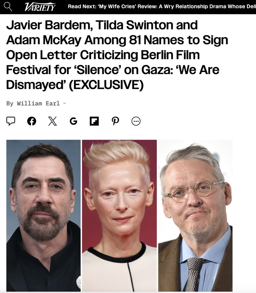 《综艺》报道,超过80位柏林电影节(Berlinale)的本届及往届参与者签署了一封致电影节的公开信,谴责其在加沙冲突问题上的“沉默”,以及对发声艺术家的“审查”。
