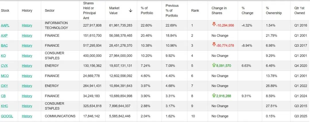 到四季度末,以持仓市值计,伯克希尔的十大重仓股都是前一季的“老面孔”,排名大多和三季度相同,只有穆迪和西方石油的排名对换。