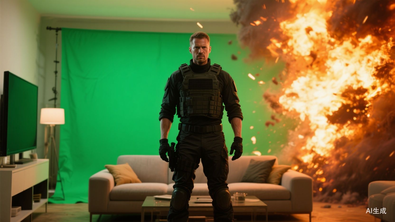 这次创作中,Alex特意尝试了Beeble插件(一款能对已拍摄完成的实拍素材进行重新打光的强大工具),成功让画面中的爆炸火光自然地投射到人物身上,营造出逼真的动态光影效果,极大提升了场景的真实感与戏剧张力。