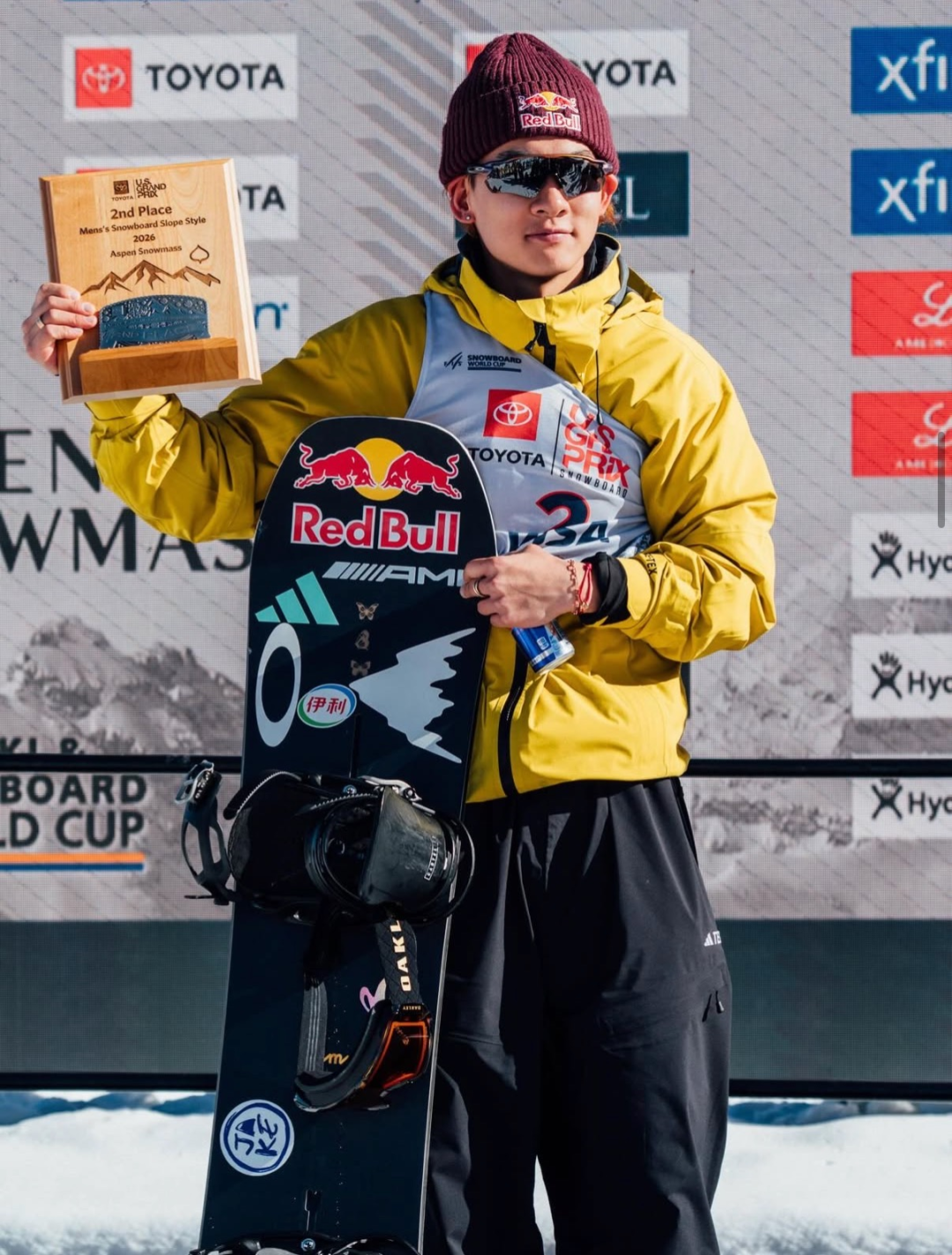 2025-2026赛季单板滑雪坡障世界杯美国阿斯本站苏翊鸣获得银牌并展示个人滑雪板