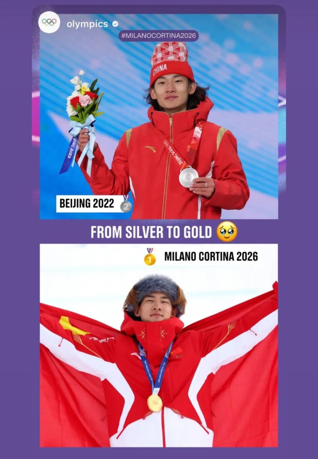 从四年前「初生牛犊不怕虎」的一鸣惊人,到四年之后以两届奥运老将的身份再度出发。面对更高的期待、更重的标签,他依旧稳稳托住自己,甚至在坡障项目中将上届的银牌提升为金牌。