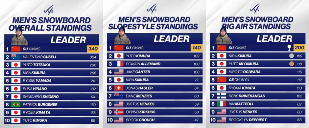 苏翊鸣在2025-2026赛季国际雪联单板滑雪世界杯中分别取得总项、坡障单项、大跳台单项男子积分榜第一名