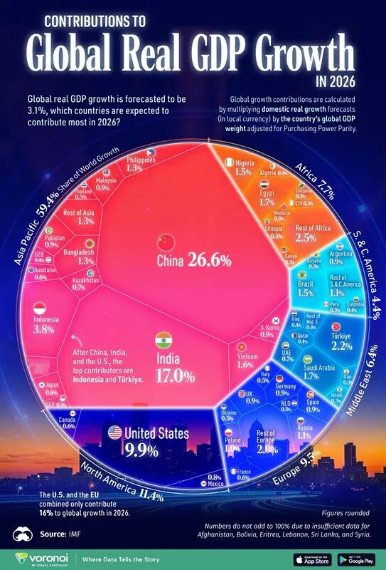 IMF预估的2026全球经济增长贡献分布,美欧已是“偏安一隅”。