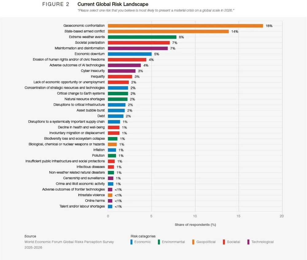 世界经济论坛最新发布的《2026年全球风险报告》在采访了全球1500位相关领域专家后认为,多边主义正在坍缩。信任衰退、透明度下降、对法制的尊重消退,以及保护主义的加剧,同时冲击着国际关系、贸易和投资,并加剧冲突倾向。受访专家普遍认为,地缘经济对抗和国家间的武装冲突,已经成为2026年最有可能引发重大全球危机的首要风险,遥遥领先于其他风险因素。