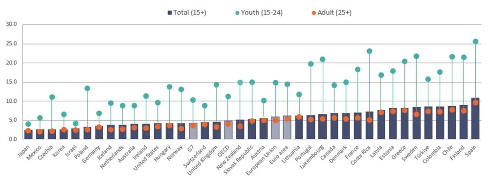 经合组织国家青年、成人及总失业率对比,部分发达国家的青年与年长者的失业比,甚至都超过了2倍乃至3倍。图表来源:OECD
