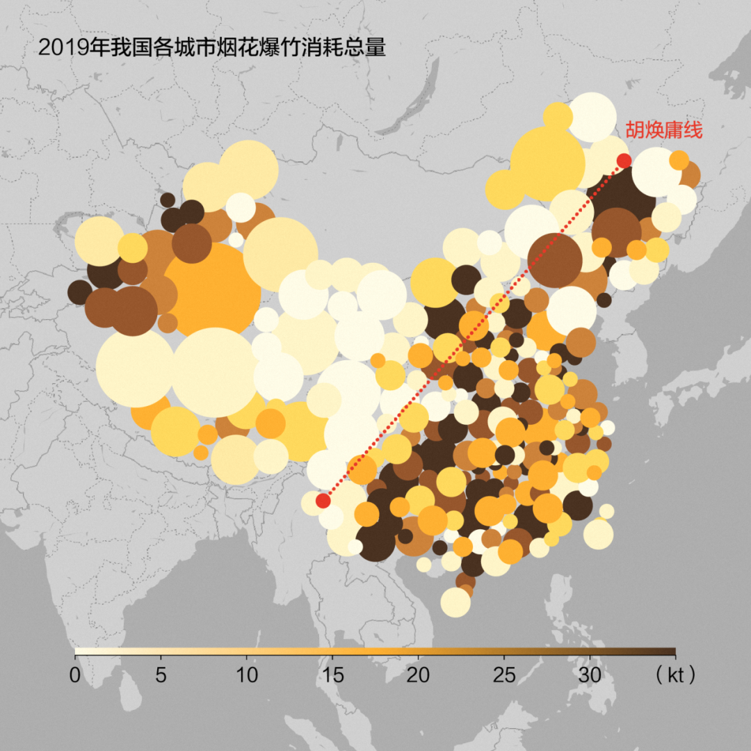 这些烟花最终奔赴远方,先走遍华夏大地,再跨越山海点亮地球。有学者利用烟花销售点、燃放点等POI数据计算了2019年我国各城市烟花爆竹消耗总量,结果显示胡焕庸线以南烟花燃放明显偏多,其中东北、湖南、江西等省份和地区较为突出;胡焕庸线以北的新疆喀什、伊宁等地烟花爆竹消耗量也很可观,烟火的气息在祖国大地皆有回响。