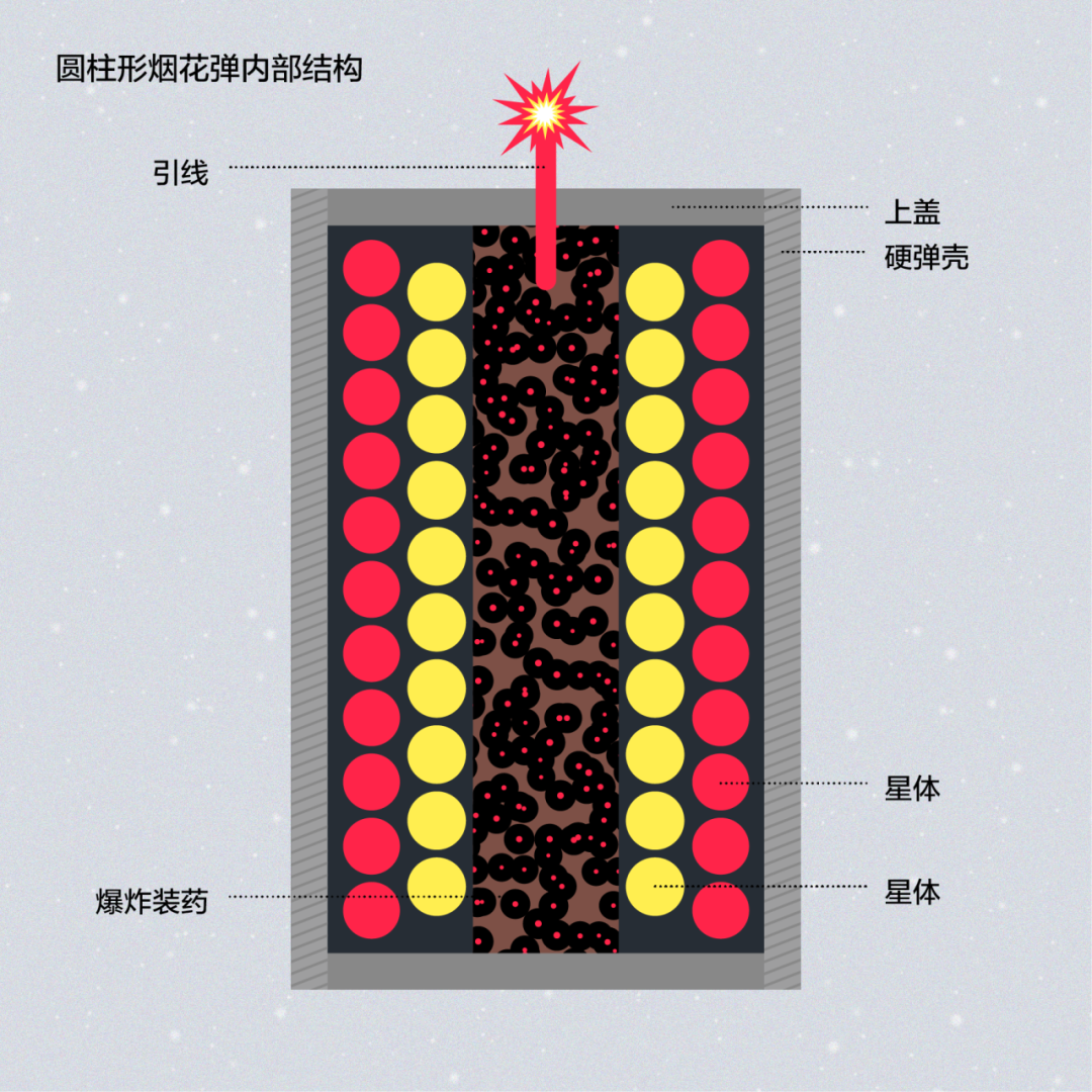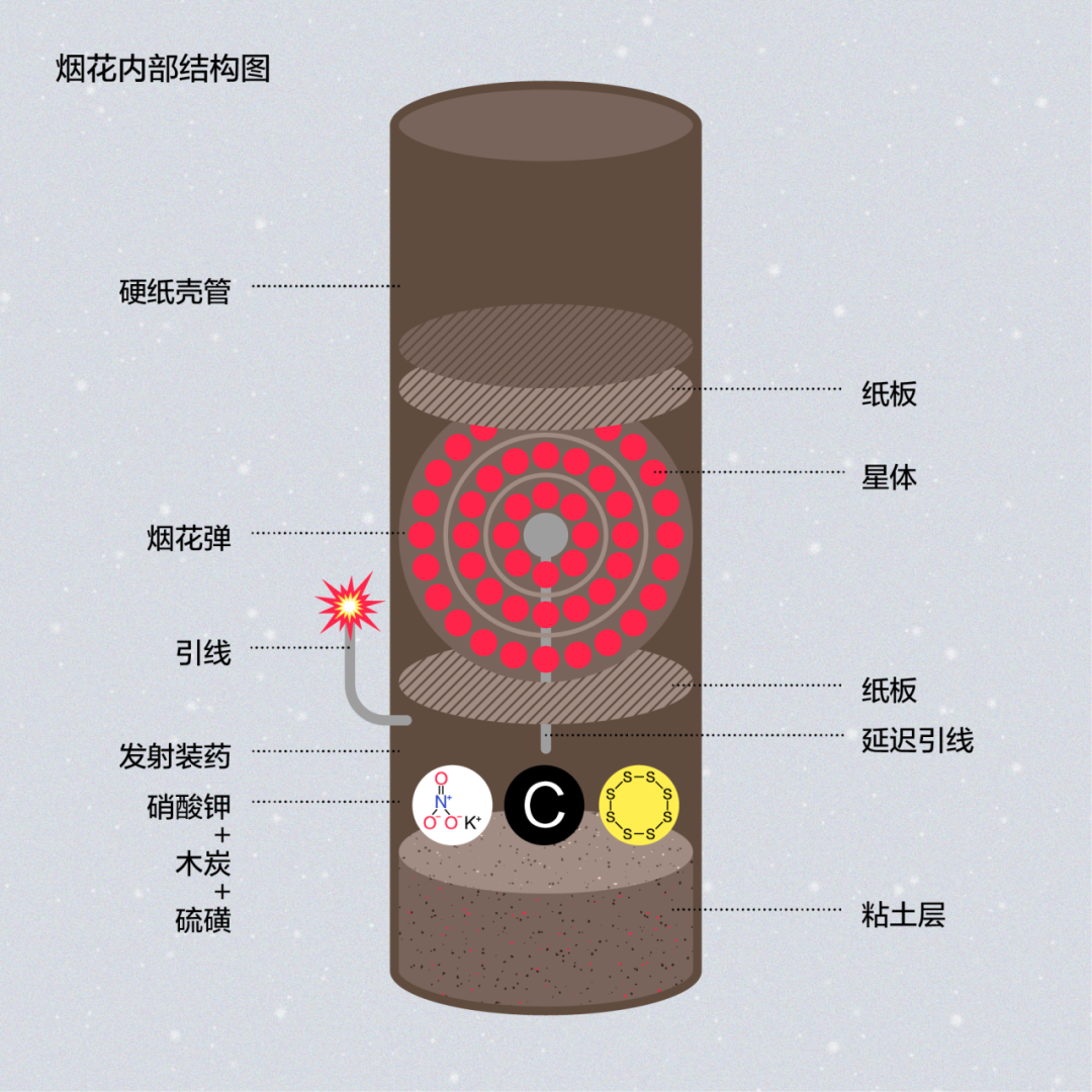 无论形态如何变换,烟花内部都有着相似的功能模块——纸或塑料包裹的外壳,提供充分燃烧的密闭空间;粘土封堵的发射部分,上部由硝酸钾(KNO3)、木炭(C)、硫磺(S)等成分组成的发射装药,燃烧后为烟花提供足够的初速度;引信由织物包裹黑火药构成;烟火弹则主要由爆炸装药及星体构成。