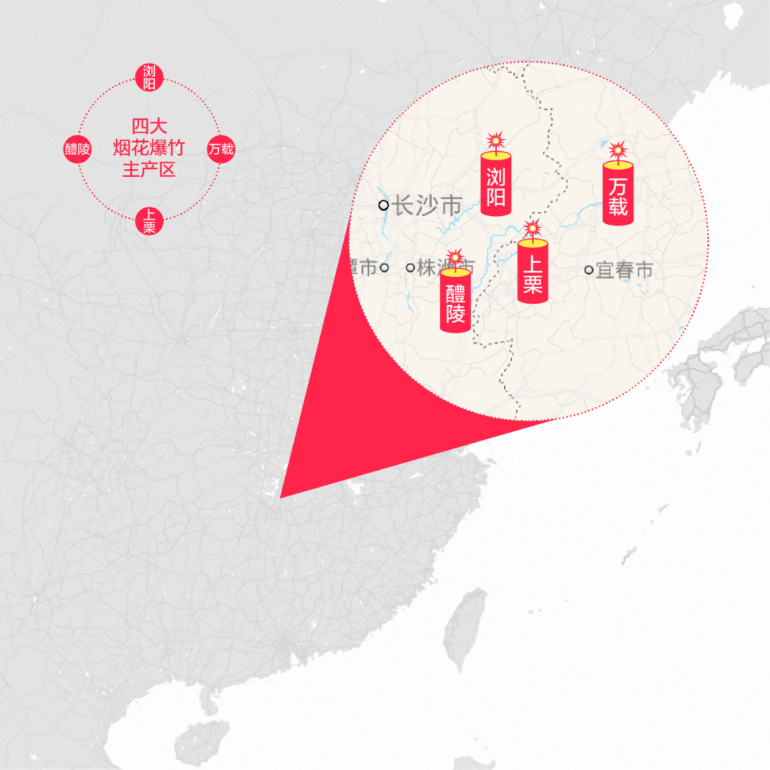 这些烟花具体扎根于哪片土壤?根据企查查数据,湖南、河南、江西三省是中国烟花爆竹企业的主要聚集地,其中湖南浏阳、醴陵,江西上栗、万载四地产量超全国80%的市场份额,撑起了中国烟花产业的半壁江山。无独有偶,这四地在地理上相互毗邻,藏身于湘赣边的罗霄山脉,澄潭江和栗水两条河流蜿蜒其间,共同勾勒出中国烟花生产的“金三角”。