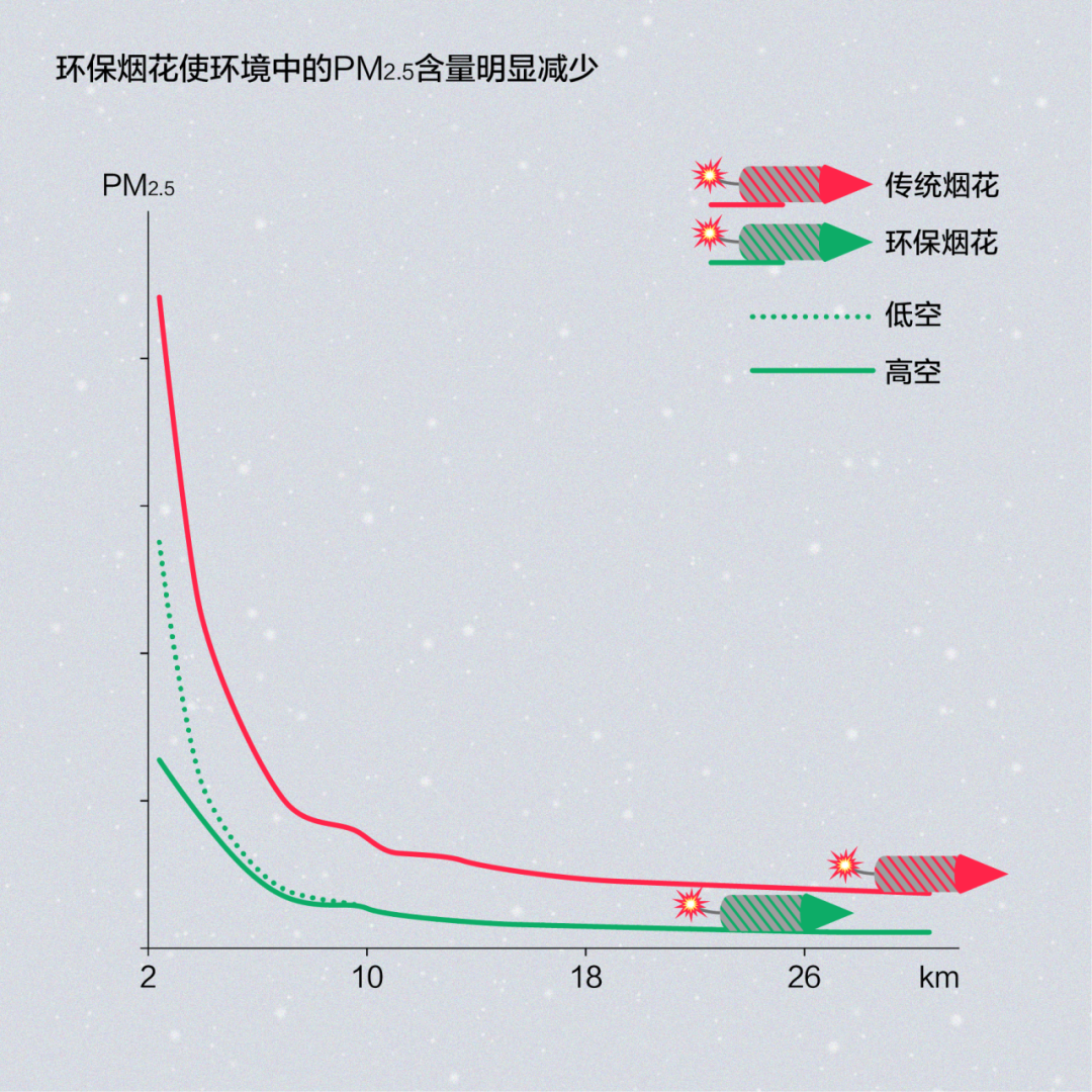 面对困境,烟花行业的从业者们从未停下探索的脚步,他们试图用更加“绿色”的环保型烟花改写产业的发展轨迹。环保烟花并未脱离传统烟花的本质,而是通过用压缩空气取代火药、减少使用重金属元素、调节氧平衡等方式,实现“减毒、减噪、减尘”目标。与传统烟花爆竹相比,环保烟花可使环境中的PM2.5降低约50%左右,然而当环保烟花燃放达到一定数量时,所造成的空气污染仍然不可小觑。因此环保烟花并非一定“环保”,限制单次使用的烟花爆竹总量仍是“绿色”烟花的唯一途径。