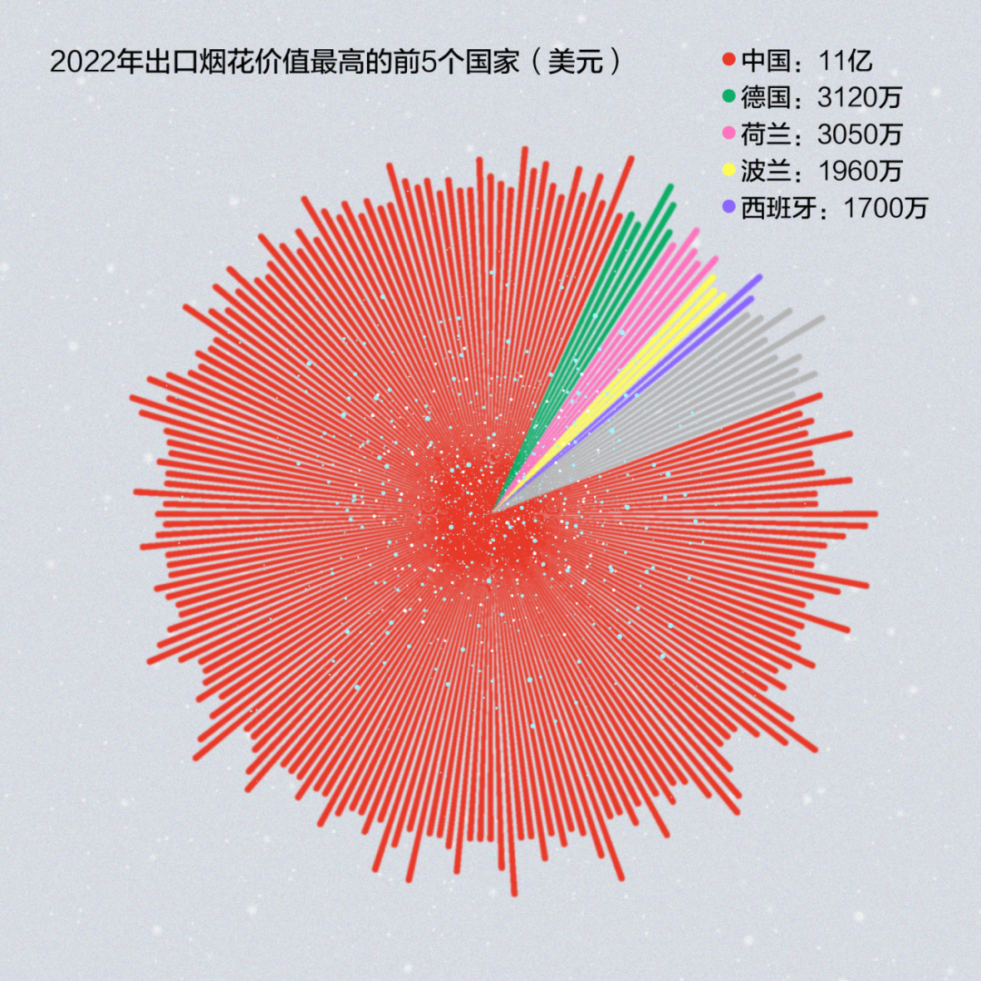 据统计,全世界每年至少有50万吨烟花在夜空中绽放,这些漫天绚烂背后隐藏着一条隐秘的流转之路。根据美国烟花协会的数据,全美大型表演中使用的烟花75%都产自中国,个人燃放的烟花有98%来自中国。中国是全世界烟花爆竹产量最大的国家,每年出口量在25-30万吨,贸易总额超过11亿美元,约占世界贸易量的80%。