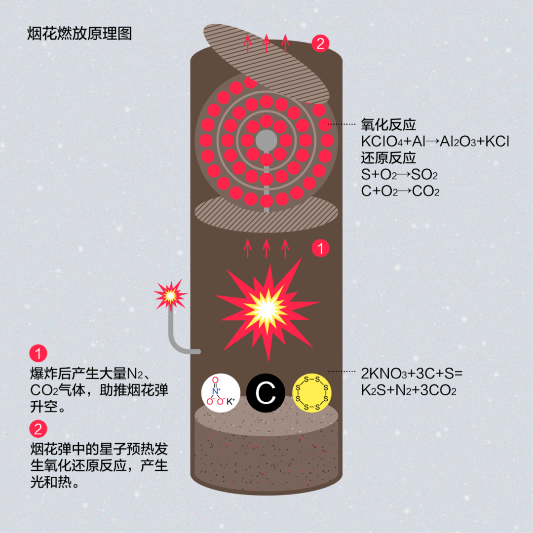 当引信被点燃后,发射装药会在狭小密闭的空间内瞬间燃烧,产生大量高温气体,这些气体迅速膨胀,给烟花弹提供足够的初速度,同时点燃延时引信。当烟花达到预定的高度时,引信点燃爆炸装药,星体中的化学物质开始产生氧化还原反应,产生大量的光和热,形成绚丽的烟花。而之所以能产生不同的图案、丰富的色彩、各异的声响,主要取决于装置的物理设计和化学构成的微妙区别。