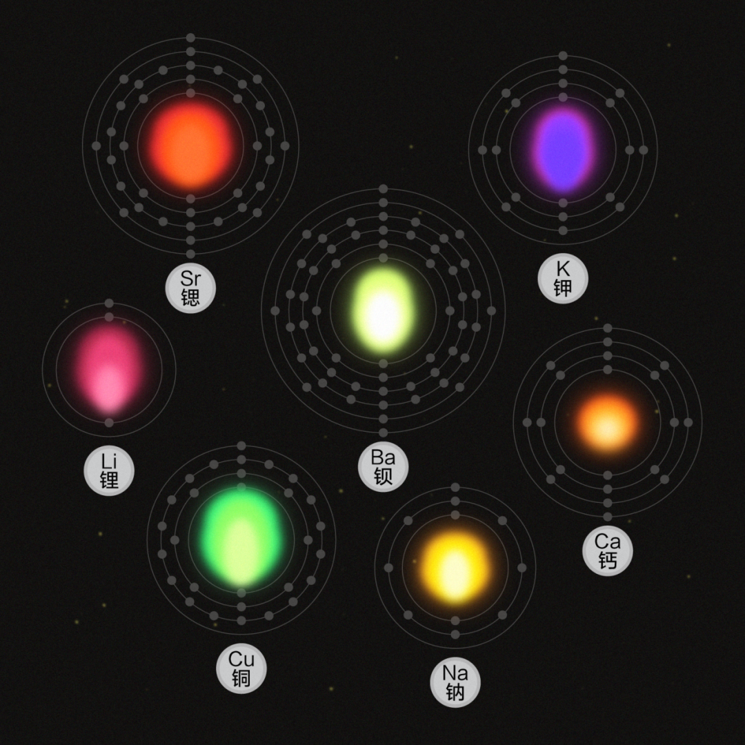 丰富的色彩则主要来源于焰色反应。当烟花中的星体被加热到极高温度时,星体中的电子便会吸收能量,产生不同波长的光,不同元素的能量不同,因此光的波长不同。例如钠(Na)原子发出的的光波长约为589nm,属于黄光,所以钠(Na)的焰色反应呈黄色;而钡(Ba)能产生绿色,锶(Sr)能产生红色,这些元素按一定比例混合几乎可以覆盖可见光谱。