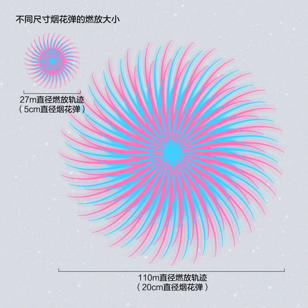 此外控制火药的成分可以实现不同的绽放轨迹,进而产生不同的花型。燃烧较快的成分,绽放时只会留下一个小圆点,就产生了牡丹型;火药燃烧较慢时会在天空拖出一条长长的线,这就是菊花型;火药燃烧更慢时,光点沿着抛物线下落,会逐渐形成弯曲的柳树型。
