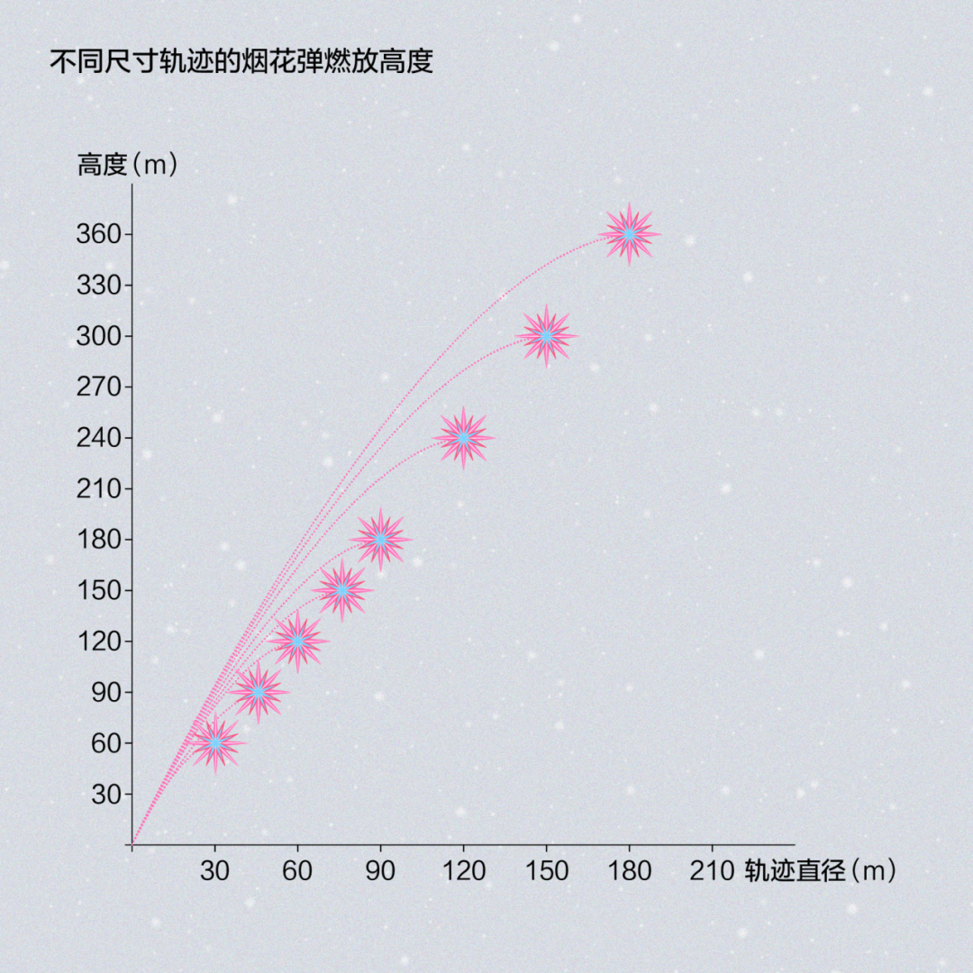 首先烟花的高度取决于其初始速度,因此其装载火药量至关重要。小型烟花的弹壳直径在5-15cm,能发射至60–150m的低空;而大型烟花表演的弹壳直径能达到1m,这些烟花通常能发射至300m以上的高度,相当于一栋超高层建筑的高度。