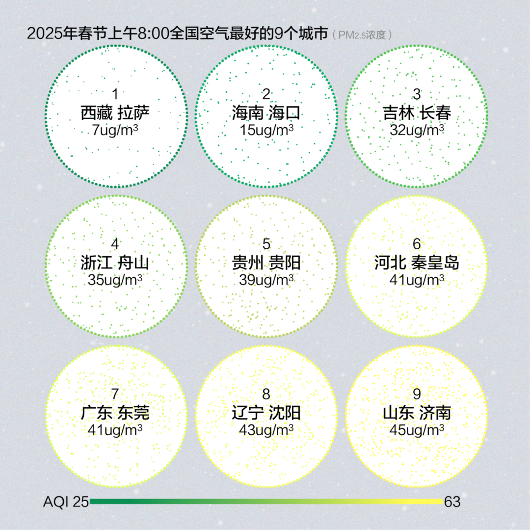 2025年春节期间各个城市空气质量正能说明这一点,当天我国168个被监测城市中,33个城市处于严重污染水平,其中最严重的安徽亳州市,AQI数值达到500,PM2.5浓度达到548μg/m3;一线城市中西安、长沙、太原、天津和武汉是污染最严重的,而济南、广州、大连、北京等城市空气质量相对较好。