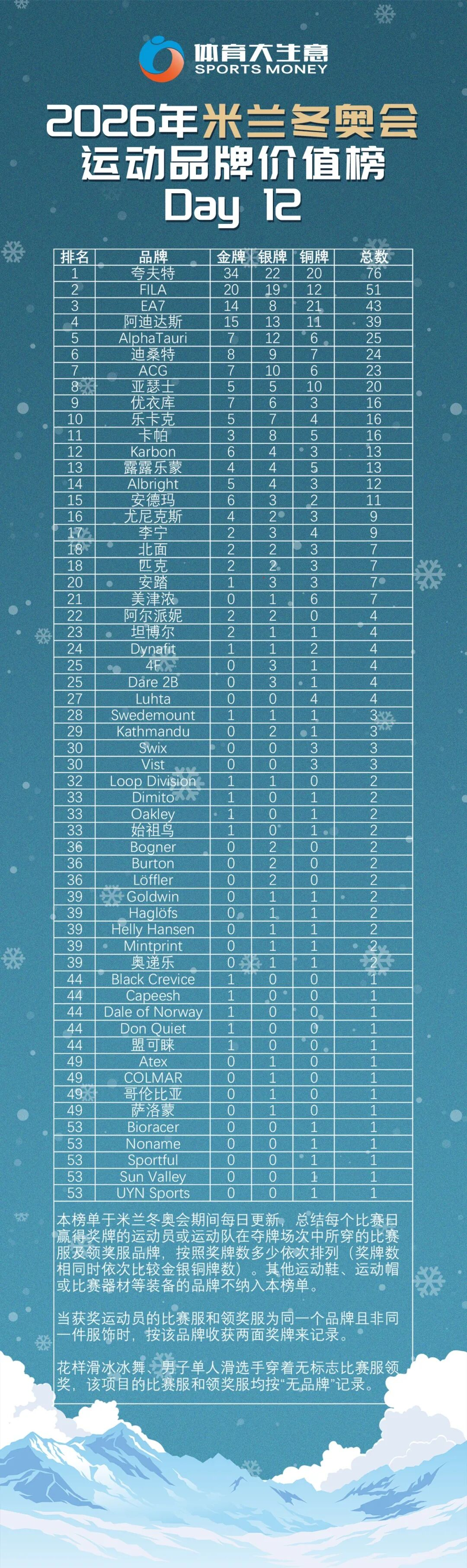 第三,安踏“左右局势”。虽然从榜单数据来看,安踏落后李宁两块奖牌,排名第20位,但实际上,FILA赞助的中国自由式滑雪空中技巧队,也与安踏集团相关。这是因为FILA在大中华区的运营权由安踏所有,即FILA赞助空中技巧队是“安踏版FILA”的决策。FILA目前在运动品牌榜以51面奖牌排名第二,此前所有奖牌都来源于滑冰赛场,包括赞助荷兰代表团以及荷兰、意大利、加拿大、挪威等国的滑冰队,以及意大利冰壶队。换言之,自由式滑雪空中技巧的两块比赛服奖牌,是FILA在本届冬奥会首次获得雪上项目奖牌。这两面奖牌对于FILA与意大利时尚品牌EA7竞争榜眼来说,带来新的支持。