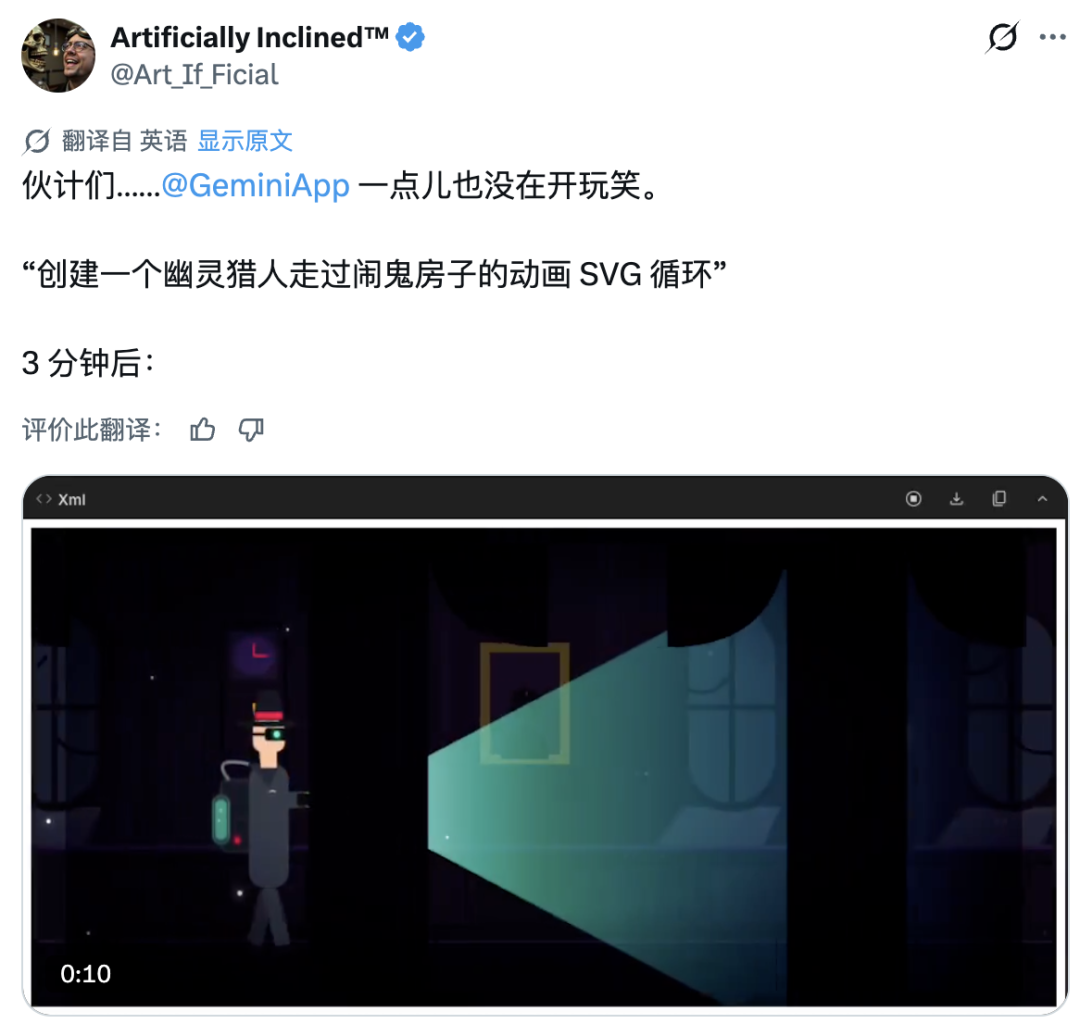 此外,网友们也贡献了不少精彩的案例。有人让3.1 Pro生成一个「鬼怪猎人穿越鬼屋」的动态SVG循环动画,结果直接看呆,评价是「Google这次是认真的」。