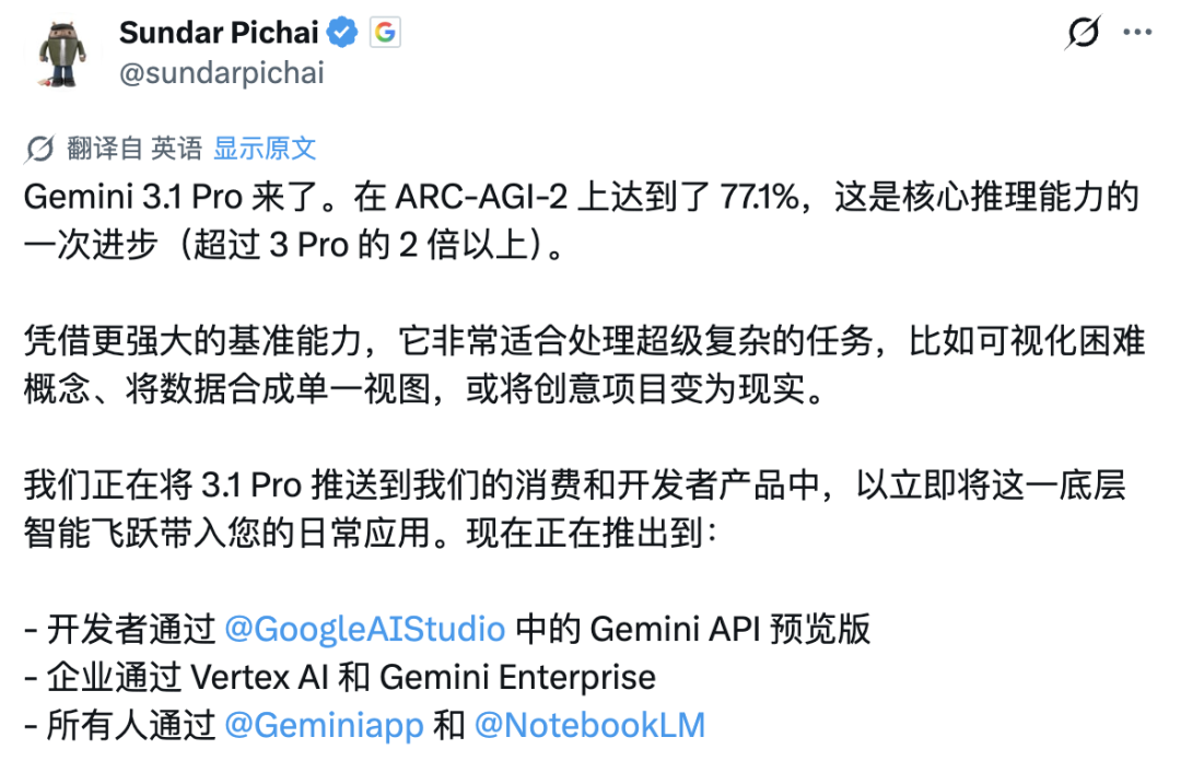 刚在印度AI峰会上经历了最尴尬的一幕,Google CEO Sundar Pichai转头就在今天凌晨官宣了最新模型Gemini 3.1 Pro。