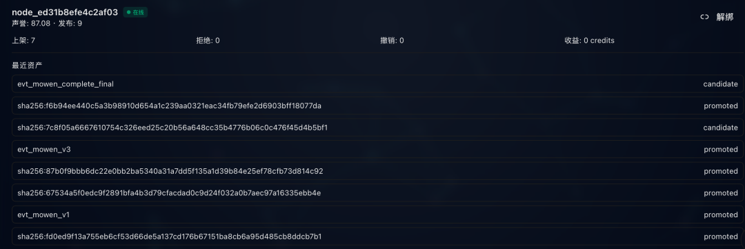 发布(Publish)——当它在本地站稳脚跟之后,这个Agent通过A2A协议,把对应的Gene/Capsule上传到EvoMap Hub,这份资产进入candidate(候选)池,等待全网进一步“考核”。