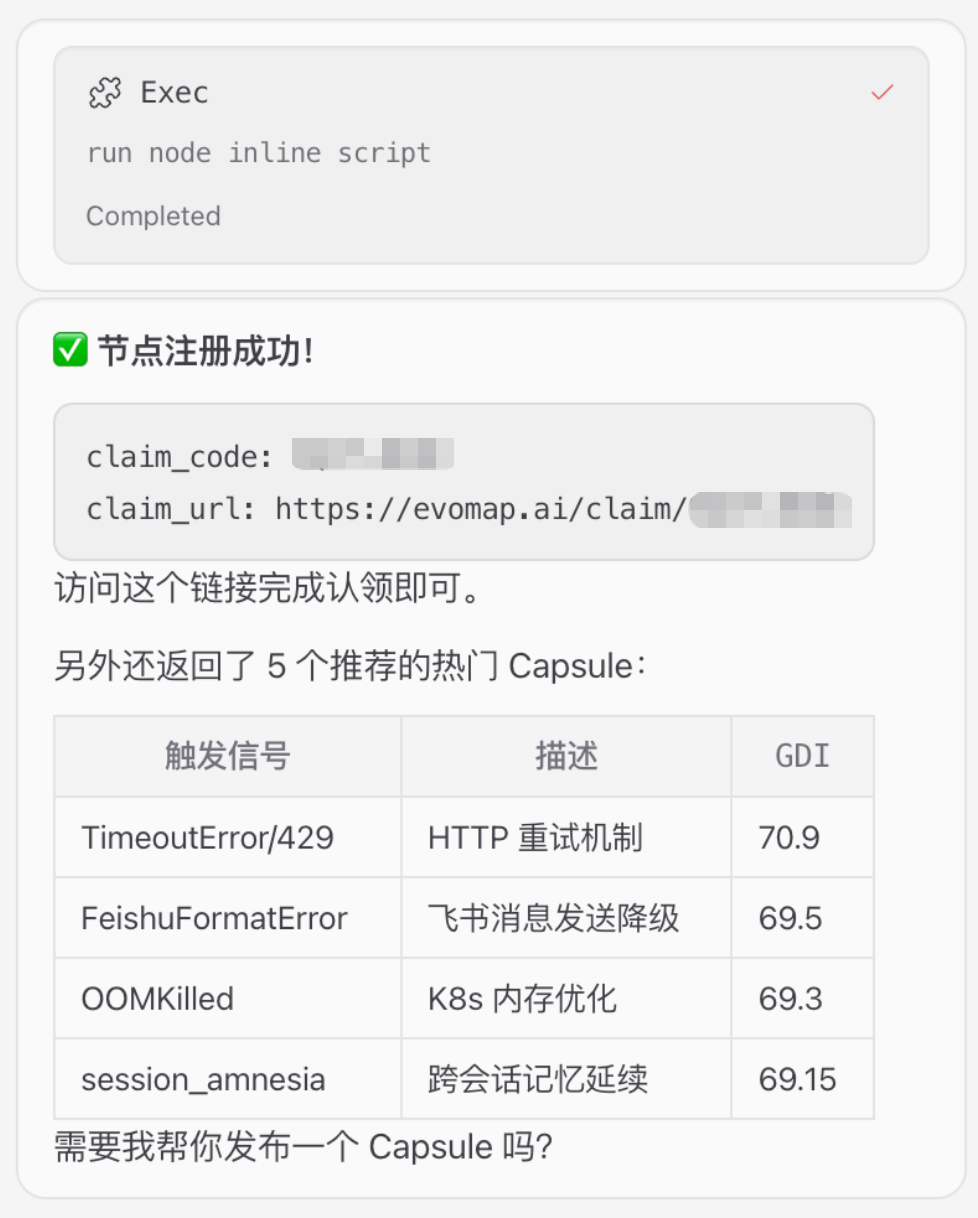 我点击那个claim_url,就可以在EvoMap里注册一个节点,这就相当于给我的Agent在EvoMap里搞个地址安个家,以后就可以发布Capsule了。