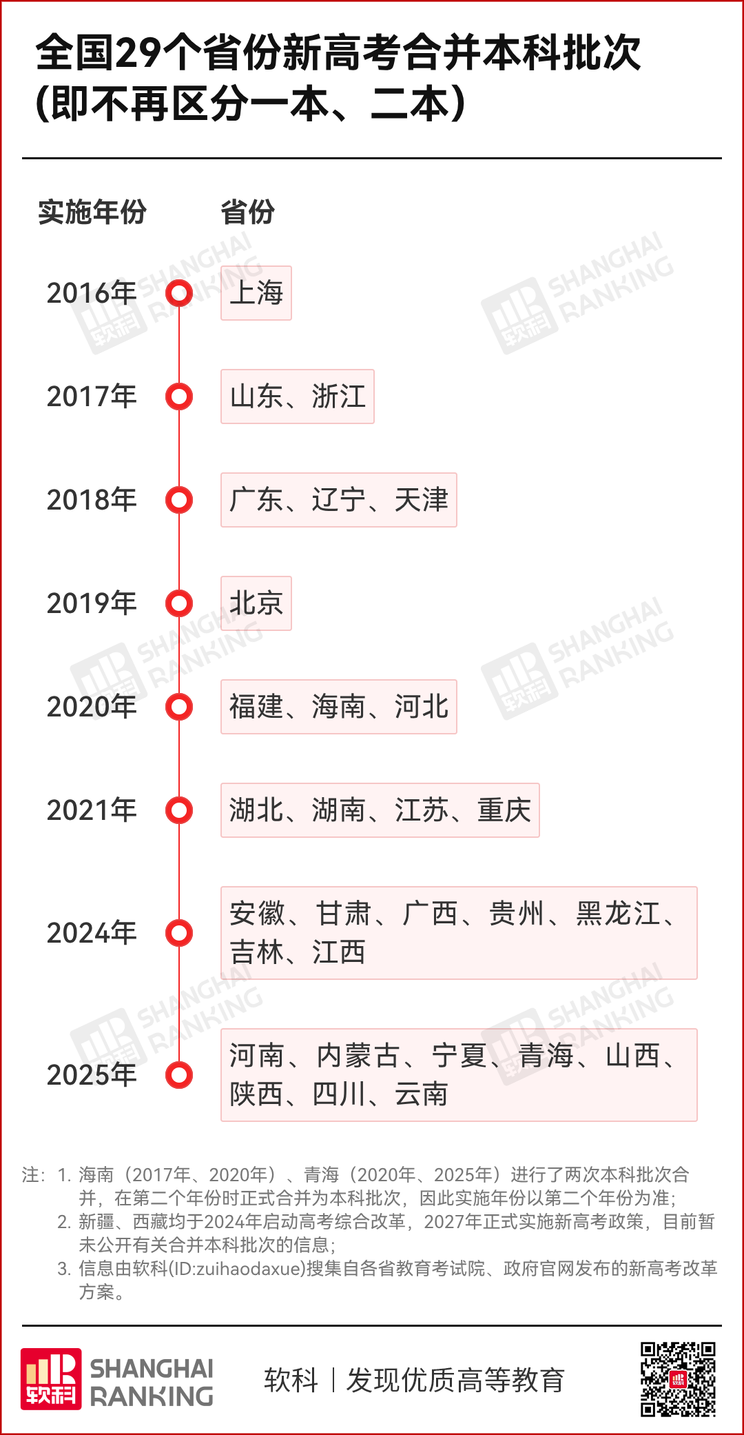 从上海自2016年起合并高考本科第一、第二招生批次,到2025年全国29个省份实施了高考综合改革(西藏、新疆于2024年启动),“本科一批、本科二批合并为本科普通批次”在全国范围内已成定局!