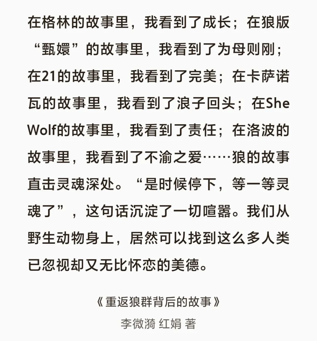 正如李微漪所说,也许人比狼高等,但是狼比人高贵,我们失去的一些东西,在动物身上仍然保留得非常完整。