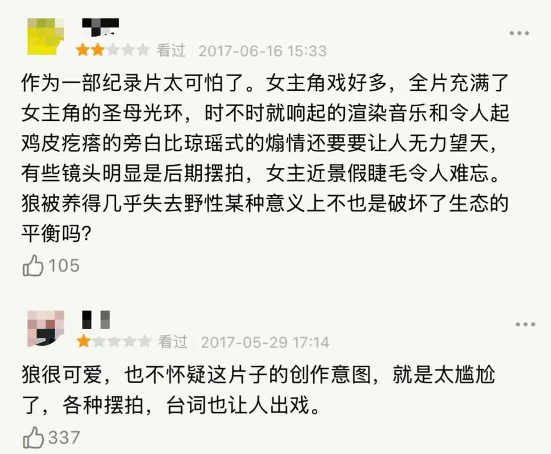 与此同时,《重返·狼群》的质疑声从未停止。有人指出,人与狼的互动有太多表演成分,纪录片被包装成了剧情片,收养、放归野狼也引发了伦理争议。