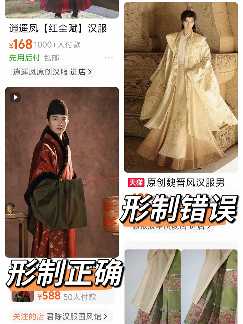 打开淘宝,用“汉服男”作为关键词可以同时搜出形制正确的“正宗汉服”和大量形制错误的“影楼戏服”