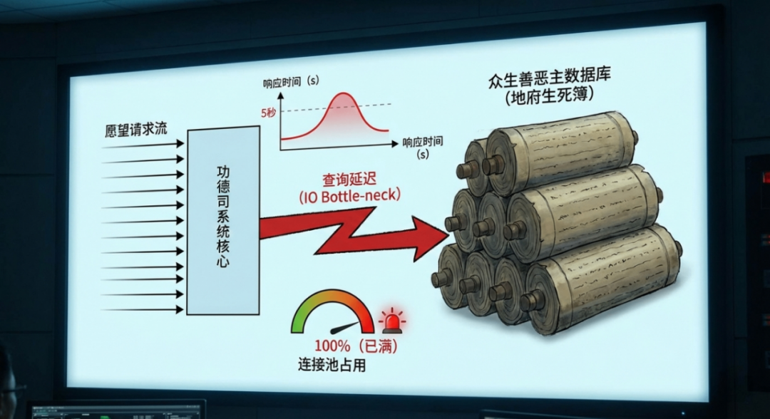 他指着监控屏上一条呈锯齿状剧烈波动的曲线,“每一条愿望请求进来,我们都要去地府的‘众生善恶主数据库’里查询其功德余额。但地府那边的数据库(DB)全是那种厚重的‘生死簿’架构,查询一次需要翻阅数万卷宗,IO读写速度根本跟不上现在的并发率。目前平均响应时间已经拖到了5秒以上,连接池(Connection Pool)全满了!”