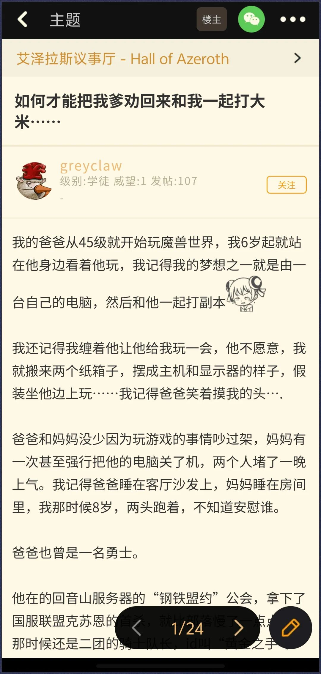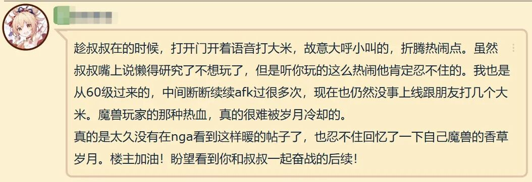 2025年9月24日,NGA论坛一篇帖子在《魔兽世界》玩家间悄然走红,标题叫《如何才能把我爹劝回来和我一起打大米……》。