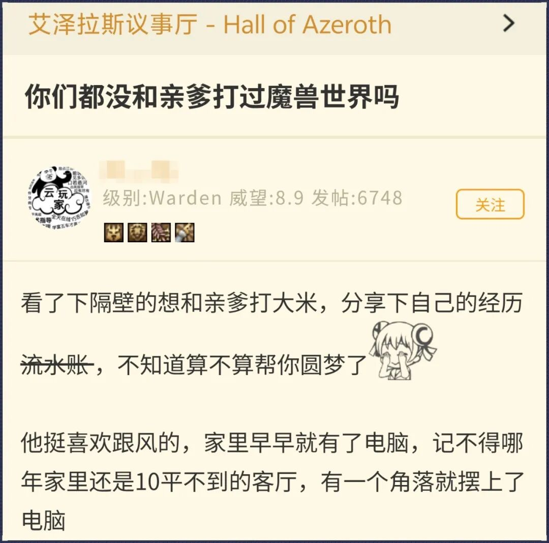 发帖人是一个“魔二代”,从小看着父亲打魔兽,长大后想拉他一起重温艾泽拉斯,却屡屡被拒,于是想让大家支支招,把老爹劝回游戏里,字里行间充满了真情流露。