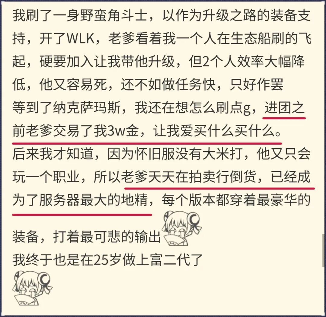 之前NGA也有帖子,楼主看到小郭“想和亲爹打大米”有感而发,说自己有个地精父亲,因为怀旧服没大秘境打,天天在拍卖行倒货,让自己在25岁做上了魔兽“富二代”。